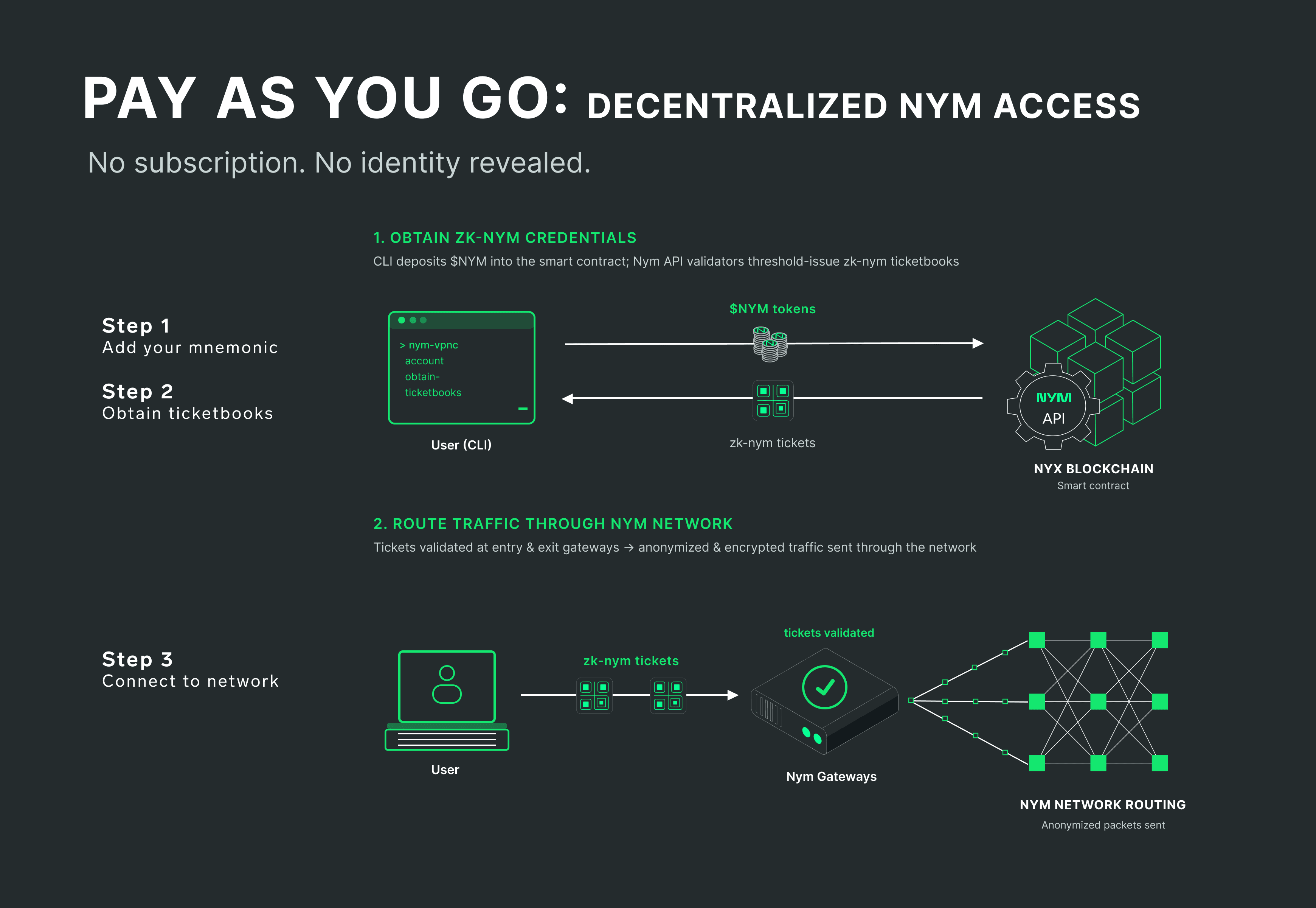 You can now access the Nym network directly with decentralized $NYM payments and anonymous zk-nym credentials. No account, no subscription, no identity revealed.