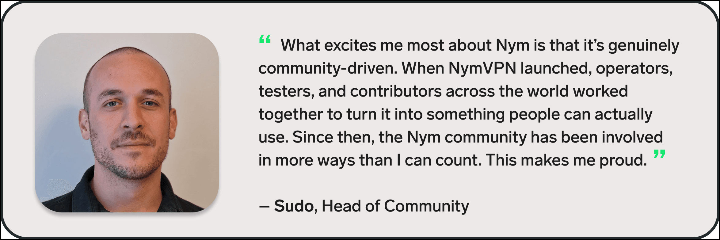 The Nym community has been a vibrant and essential part of making NymVPN what it is today. They were the frontline of early alpha and beta testing, the first early adopters of the paid app, and weekly bug hunters for every new release.