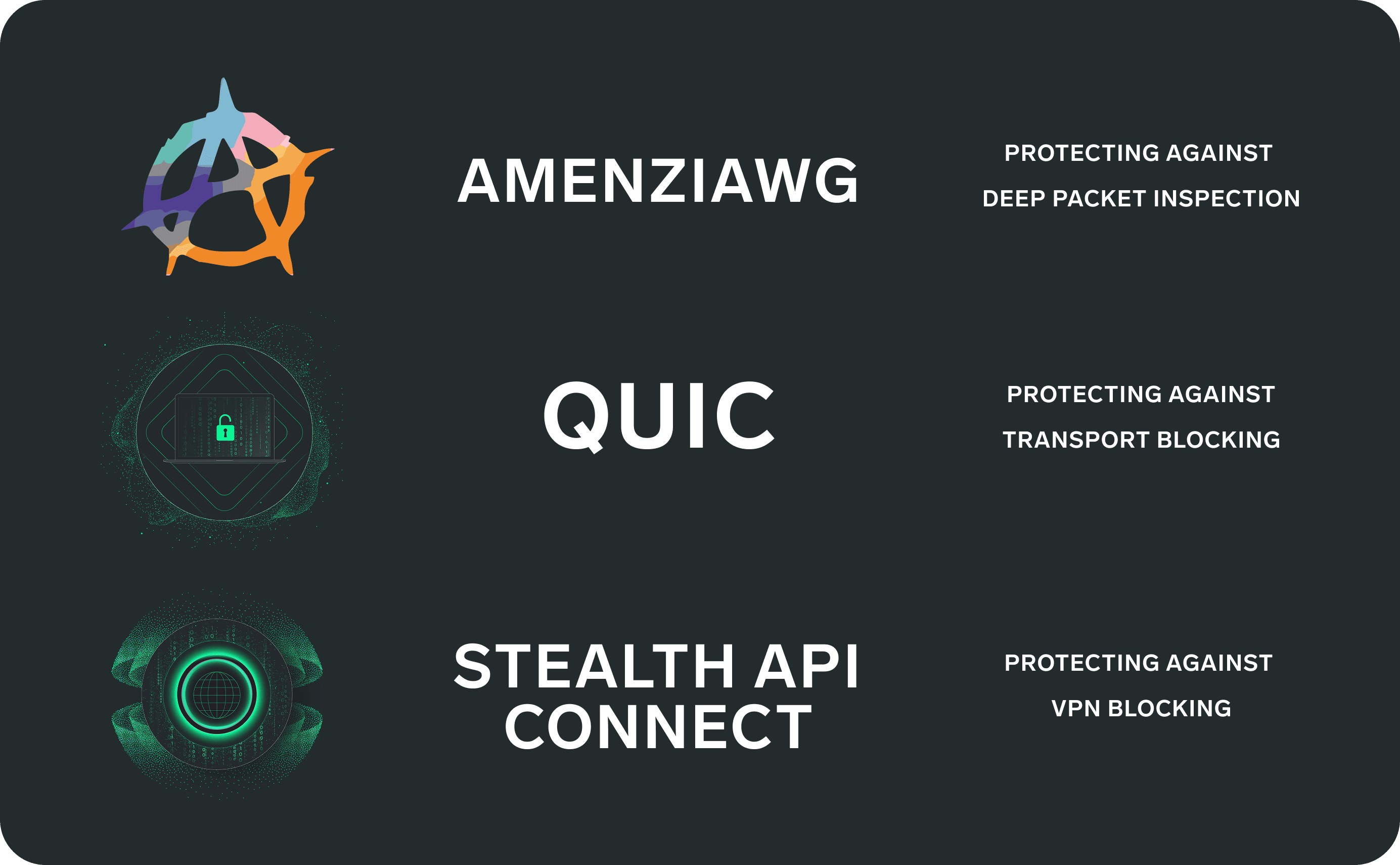 We then made QUIC available as an optional anti-censorship tool for users. By wrapping WireGuard’s UDP traffic with QUIC, your use of the VPN tunnel can be disguised from VPN blocking.