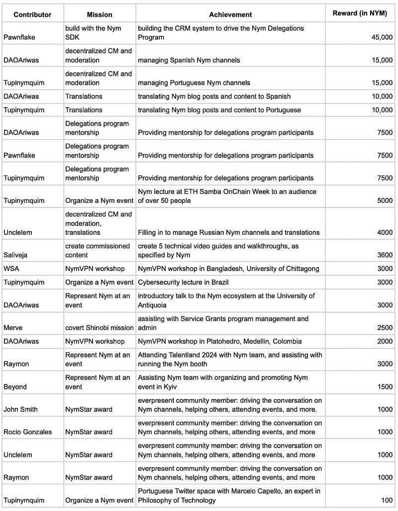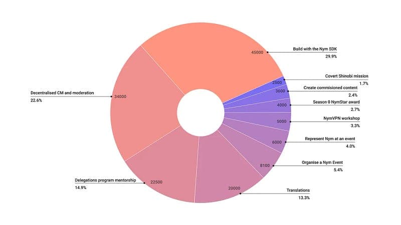 L’équipe de Nym a délégué 30 250 000 jetons NYM à 121 mix nodes indépendants gérés par la communauté, plaçant 250 000 NYM sur chaque nœud dans le cadre du Programme de Délégations Nym. Durant la saison 0 de la ligue, le Nym Squad Wealth Fund a accumulé 475 256 NYM en récompenses de staking. Ces fonds font maintenant partie de la trésorerie communautaire et sont distribués aux participants de la Ligue Nym Squad à travers différentes saisons.
