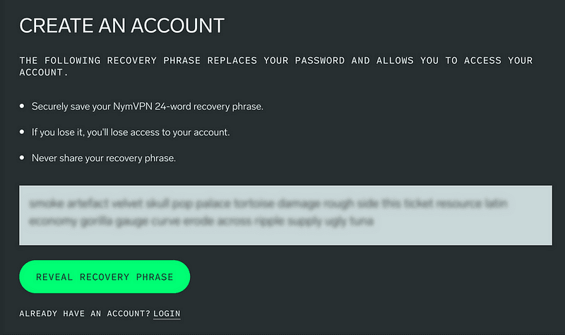 • Crie sua conta NymVPN e certifique-se de salvar seu código de acesso mnemônico em um local seguro!