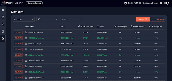O Nym Explorer é uma janela para a Nym mixnet de privacidade. Ele permite que as pessoas naveguem em todos os diferentes nodes que compõem essa infraestrutura global, avaliem seu desempenho, sua reputação, onde estão localizadas e muito mais. Se você é um detentor de token NYM, o Explorer é provavelmente uma de suas ferramentas essenciais para selecionar um mixnode, delegar participação e começar a ganhar. Mas você teria que copiar o ID do node’ do explorador e depois ir para a sua carteira desktop delegar.
