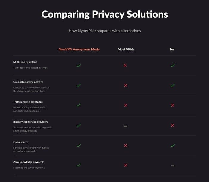 Outras redes de privacidade semelhantes geralmente dependem apenas de voluntários e podem sofrer com uma qualidade de serviço inferior em determinados casos. Os nós da Nym são alternativamente incentivados com tokens NYM para executar nós de alto desempenho para os clientes de uma forma que proteja a privacidade de toda a rede.