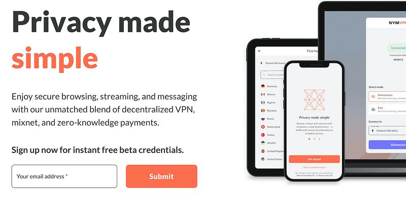 Помните, что бета-тестирование полностью бесплатно . В конце концов, вы помогаете Nym создать лучшее приложение для конфиденциальности для вас. Прямо сейчас анонимная система учетных данных будет не связана с вашим адресом электронной почты. С полным коммерческим запуском это станет полностью анонимной платежной системой, в которой пользователи смогут безопасно и конфиденциально использовать криптовалюту и кредитные карты для покупки NymVPN.