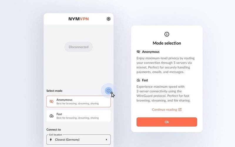 NymVPN имеет два различных режима, позволяющих выбрать собственный уровень анонимности и скорости.