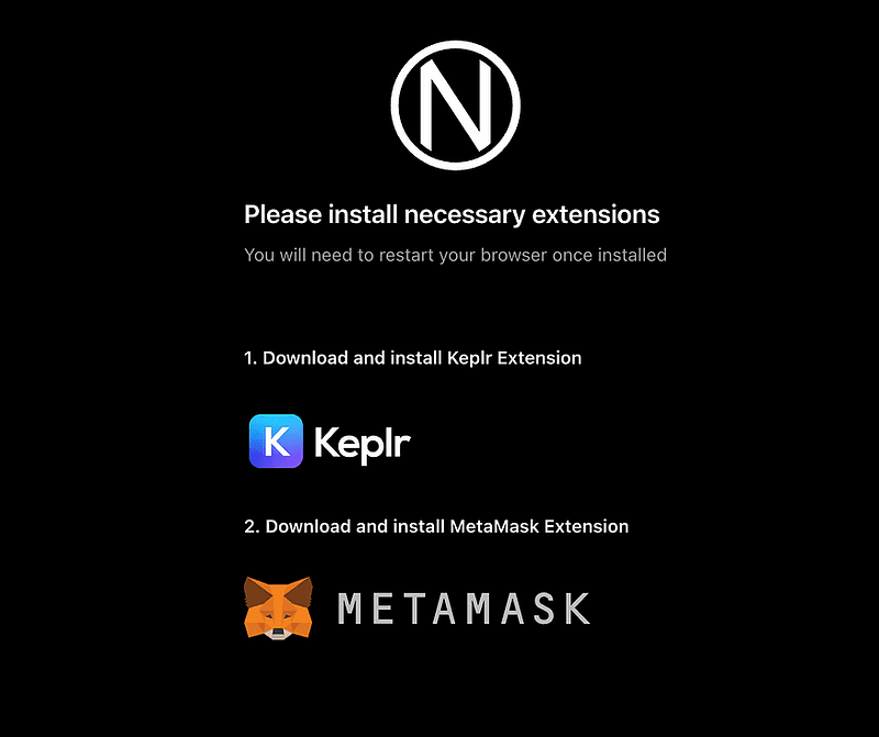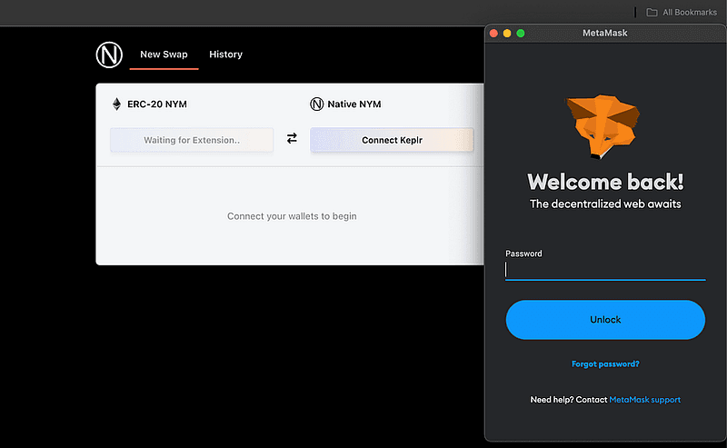 Nym Swapper — это автономный веб-интерфейс для обмена токенов между кошельками MetaMask (Ethereum) и Keplr (Cosmos), но в будущем появятся новые интеграции кошельков! Если у вас не установлены эти кошельки или они не обнаружены в вашем браузере, интерфейс предложит вам их установить.
