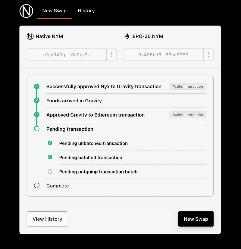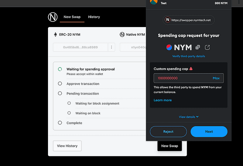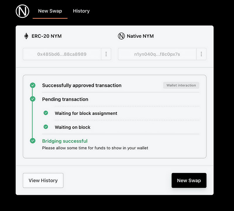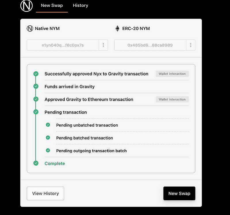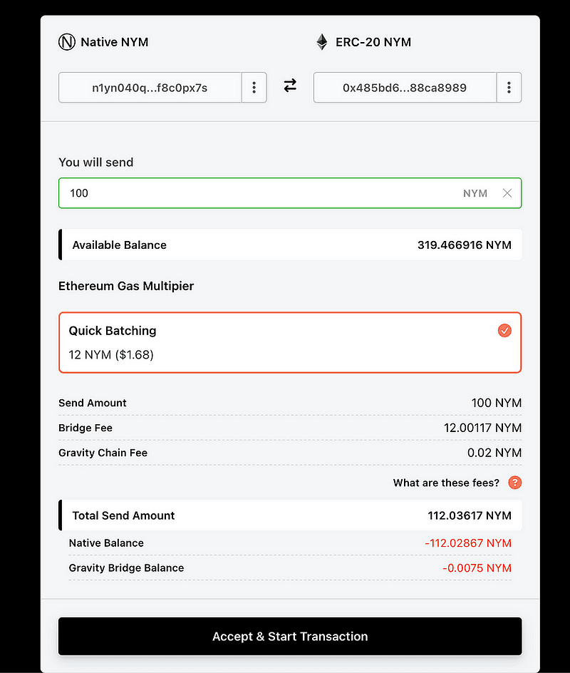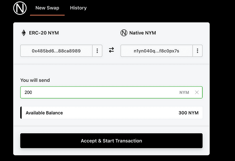 Переход с ERC-20 NYM на собственный NYM в цепочке Nyx прост. Просто введите сумму, которую вы хотите обменять, и нажмите «Принять и начать транзакцию». Затем своппер покажет ваш существующий баланс Ethereum NYM.