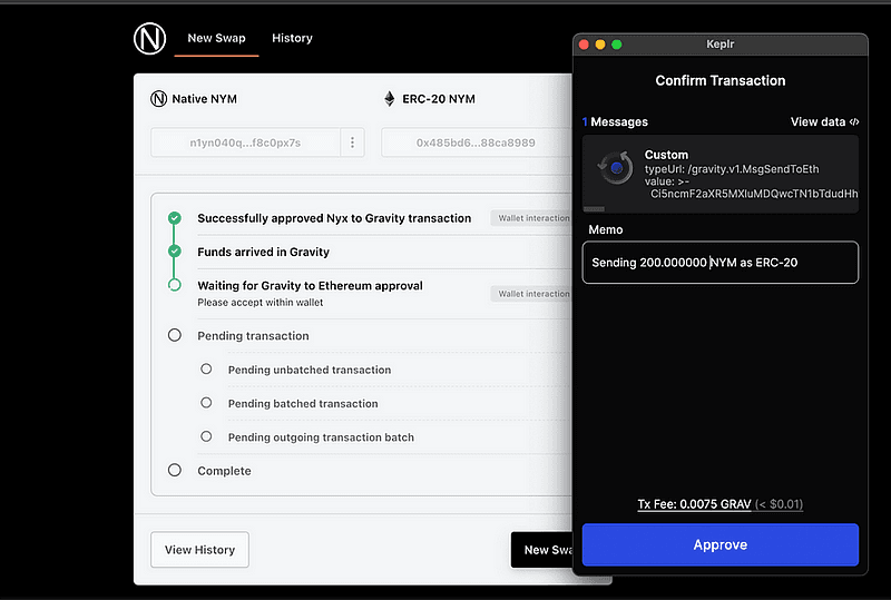 Но не теперь! Благодаря Nym Swapper токены NYM теперь можно легко обменивать между собственной цепочкой Nyx (Cosmos) и Ethereum. Членам сообщества Nym больше не нужно проходить трудный процесс перевода . С новым интерфейсом обмена это можно легко сделать, подключив кошелек MetaMask и Keplr к веб-приложению, что сделает токены NYM более ликвидными для ставок и вознаграждений.