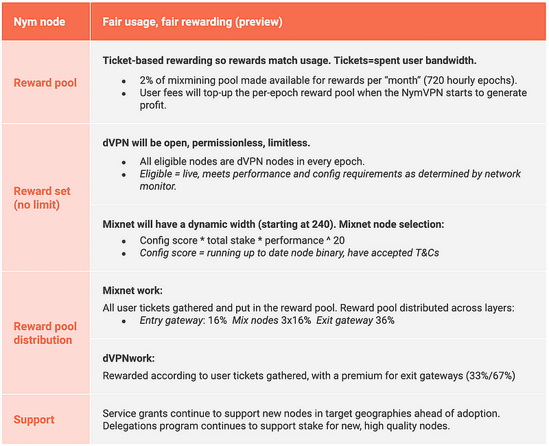 Для стейкеров и операторов конечной целью является быстро масштабируемая сеть без ограничений на количество шлюзов. Награды будут основаны на билетах, собранных шлюзами и представляющих реальное использование. Ноды будут многофункциональными. У них будет постоянная возможность зарабатывать награды dVPN как входящие и исходящие шлюзы. И они будут конкурировать друг с другом каждую эпоху за шанс заработать дополнительные награды, попадая в активный сет микснета, генерирующего шум Nym, как шлюзы или миксноды.