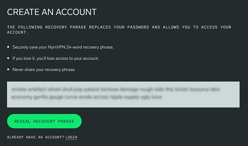 - NymVPN hesabınızı oluşturun ve mnemonik Erişim Kodu’nu (mnemonic Access Code) güvenli bir yerde saklayın!