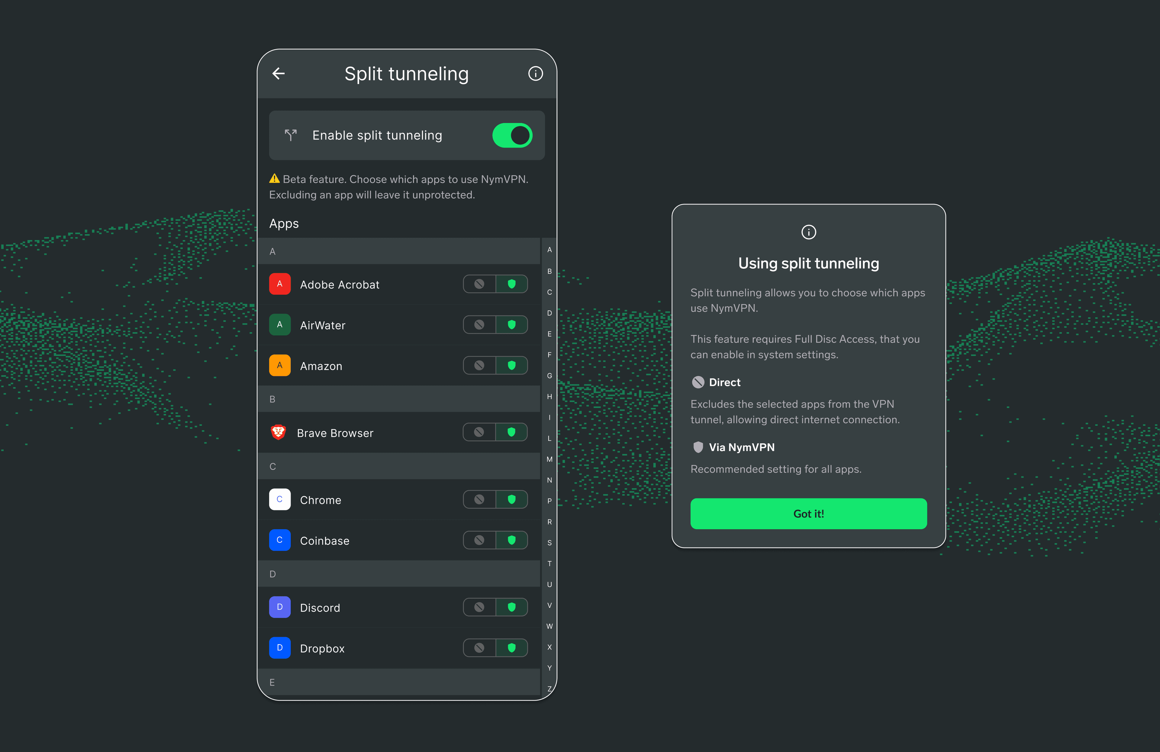 - A more advanced form of split tunneling is also being developed which will allow you to route specific apps through either the NymVPN Fast mode or Anonymous mode.