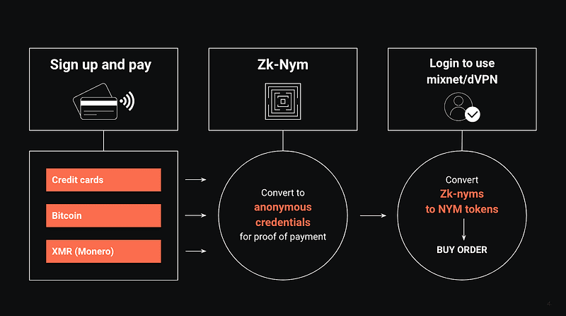 Vì lý do này, Nym đã phát triển một hệ thống thanh toán ẩn danh, được gọi là Zk-Nyms (thông tin xác thực zero-knowledge). Về cơ bản, đây là một loại chữ ký ẩn danh cho phép người dùng tạo thông tin xác thực mà không cần cung cấp cho Nym, nhà cung cấp dịch vụ, thông tin chi tiết về danh tính của họ. Theo cách này, Nym với tư cách là một công ty không biết ai đang trả tiền cho ai, chỉ biết rằng có thông tin xác thực hợp lệ để sử dụng mạng.