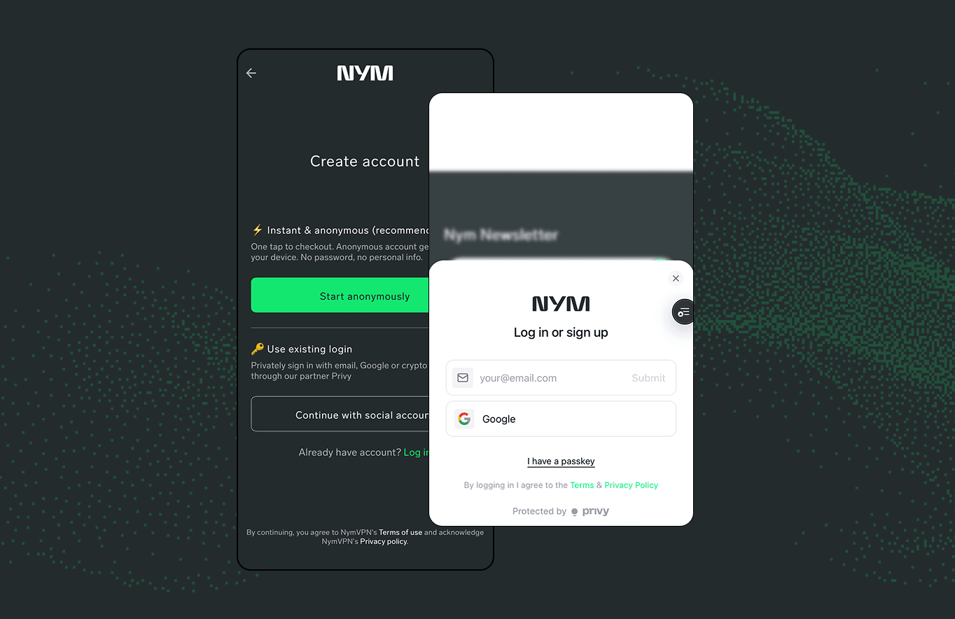In addition to logging into or creating an anonymous NymVPN account, NymVPN also allows you to use another personal account for the convenience of logging in or to safely recover your passphrase.