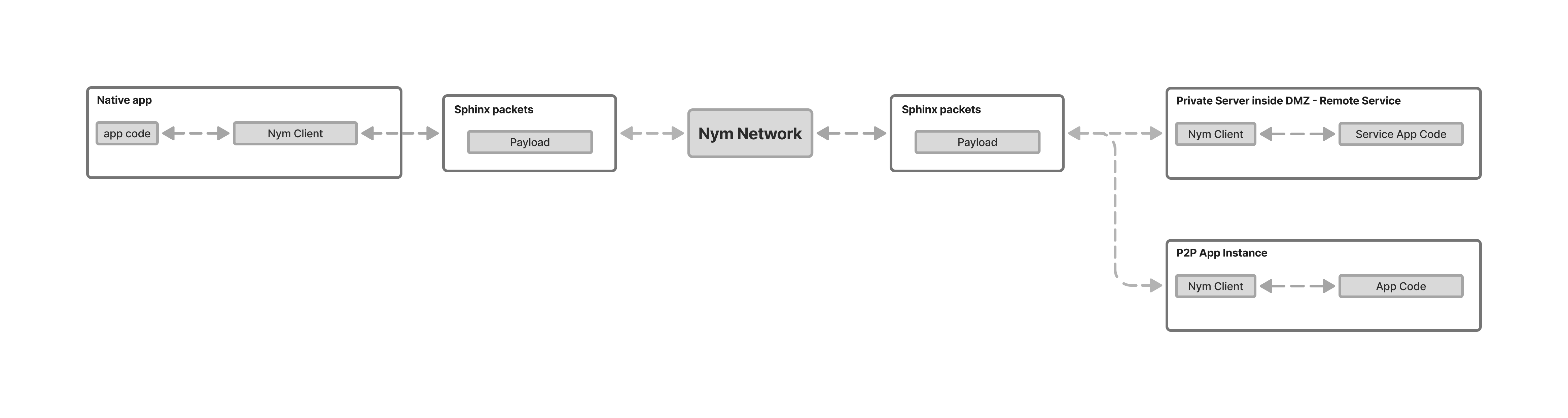 You might want to embed Nym Clients in both sides of your app, and have them send all of your app network traffic through the Mixnet: maybe two clients in a peer to peer setup, or a client and a server where it is possible for you as a developer to release both the client and server side code, and have some ability to make sure that it is being run.