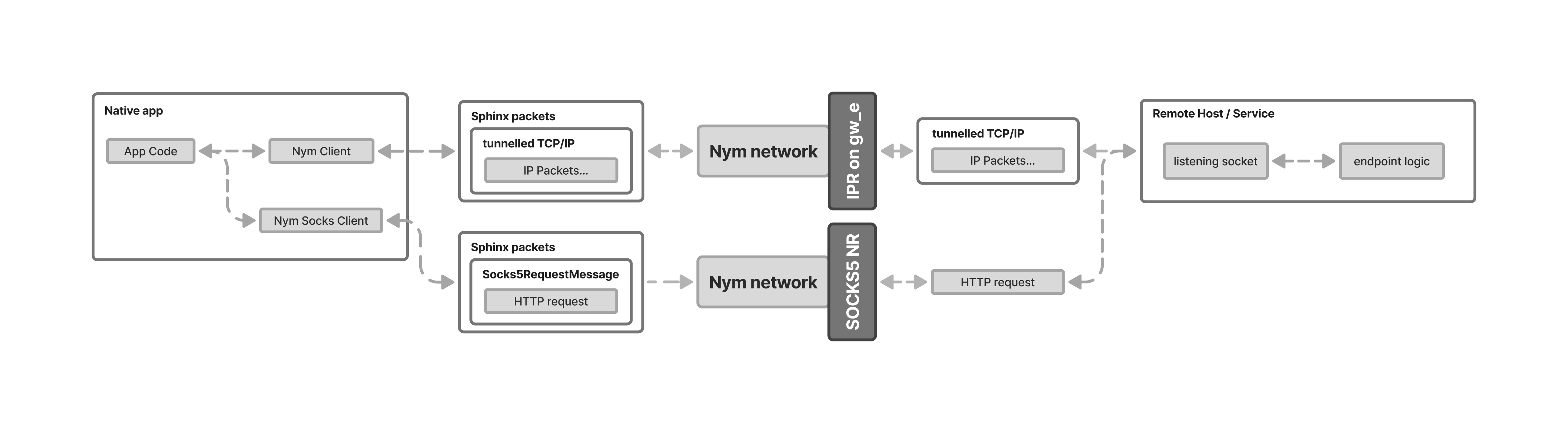 Developers with apps that support SOCKS4,4a, or 5 can use the Socks Client exposed by the Mixnet module. This uses the Network Requester service of the chosen Exit Gateway to interact with the remote host via the chosen SOCKS proxy protocol. The Network Requester uses SURBs to anonymously reply to the original sender with whatever response it gets from the remote host.