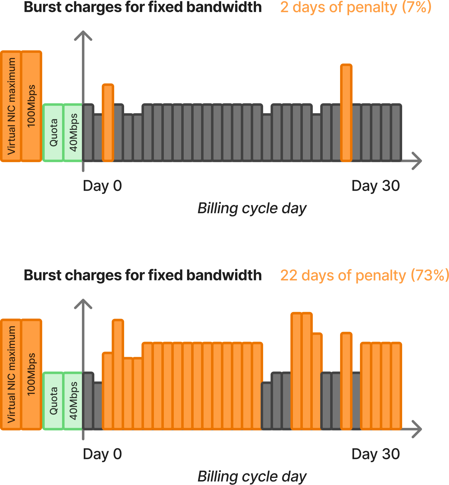 - Fixed quota with burst: you get a fixed outbound network rate, but can burst above it