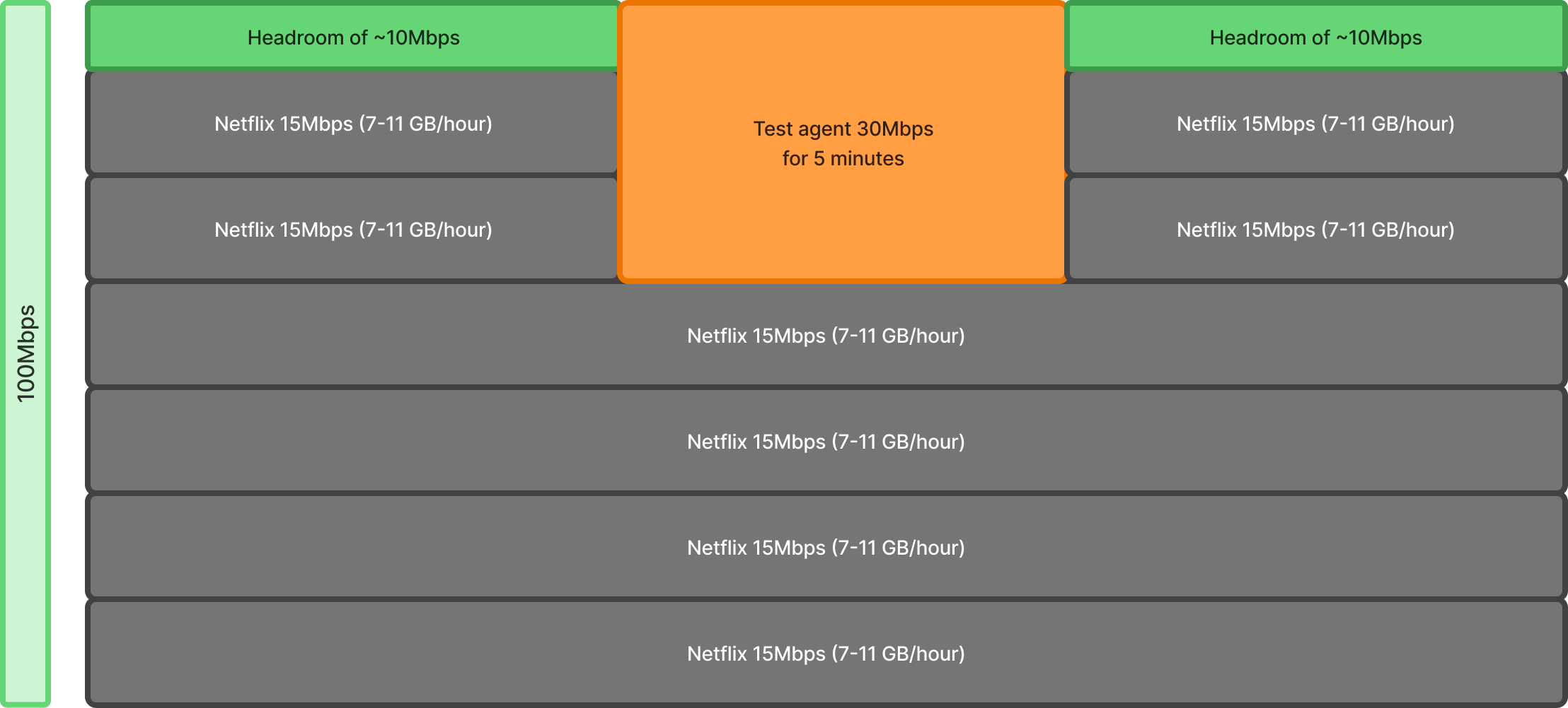 Imagine there are 6 * Netflix 4k users on a 100Mbps Gateway, let's look at different traffic stream scenarios: