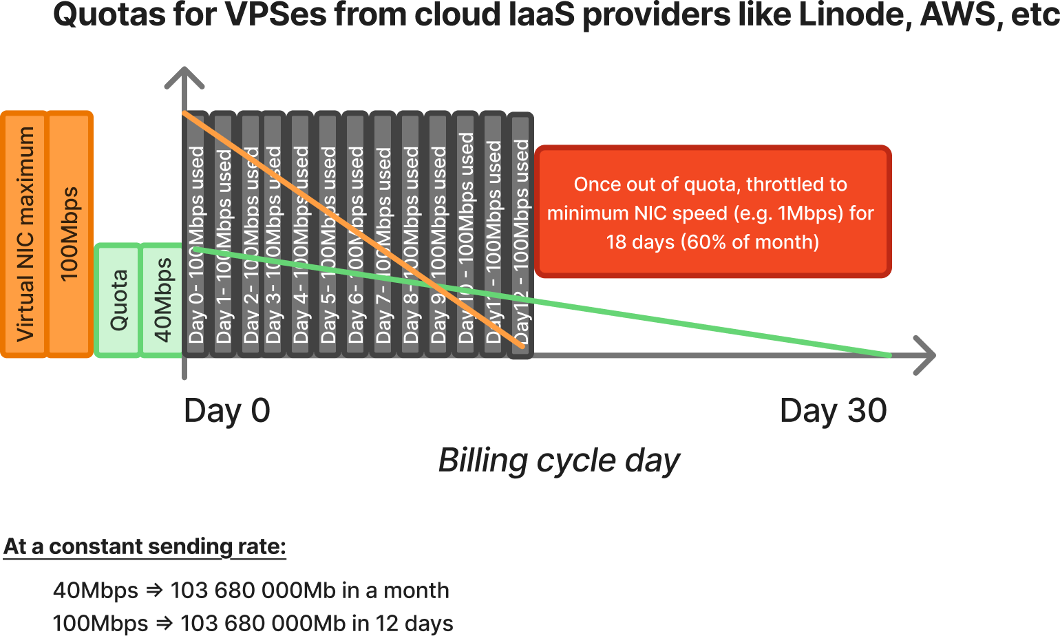 - Fixed quota: you can only use the outbound networking available, e.g. AWS limits to 100Mbps