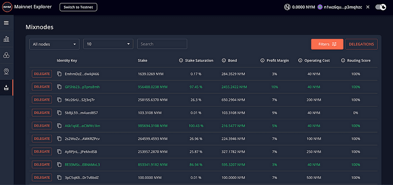 - 使用您的标准筛选节点列表(对于新手:寻找饱和度较高、运营成本/利润率较低的节点),然后点击所选混合节点旁边的委托按钮